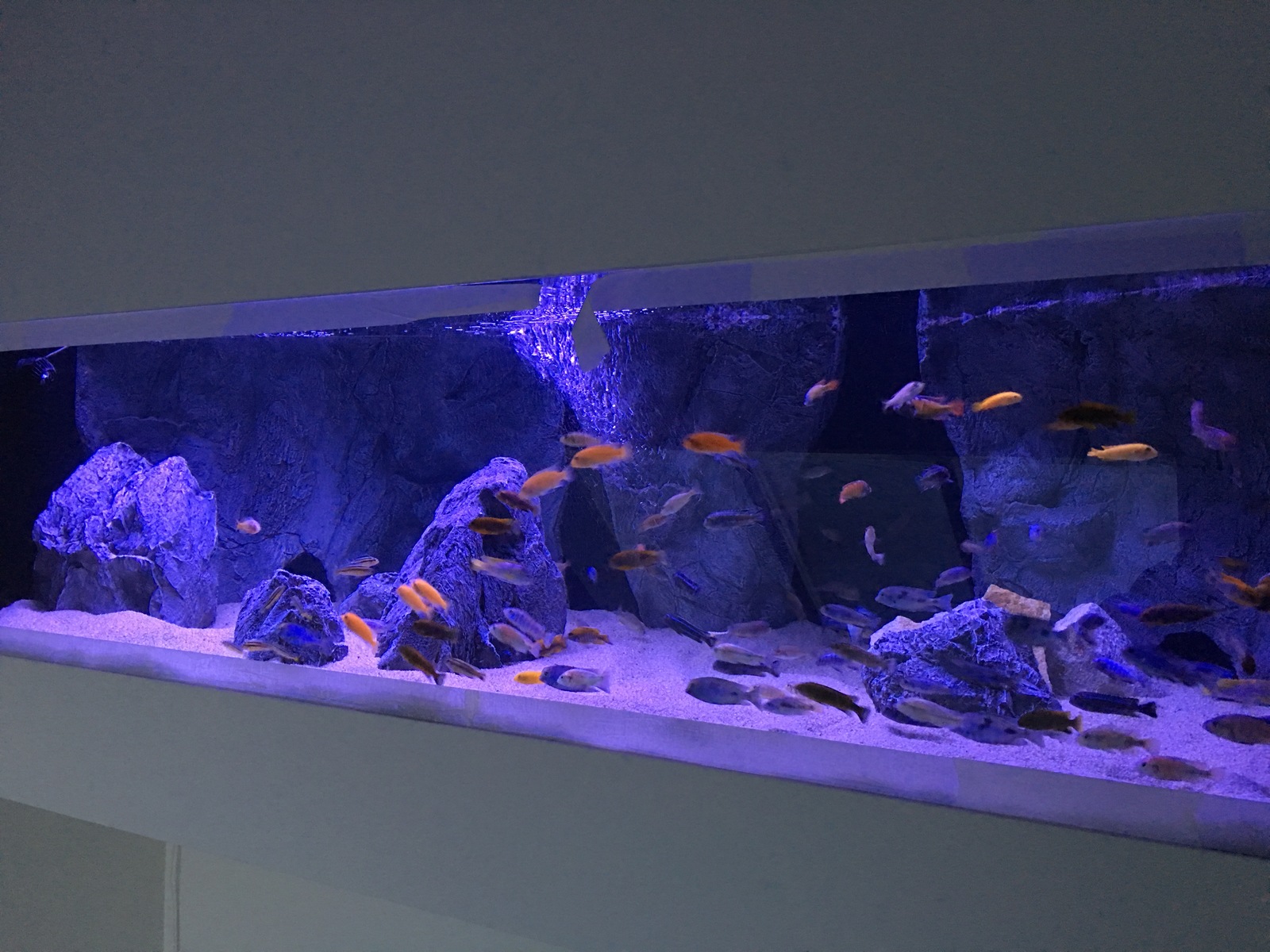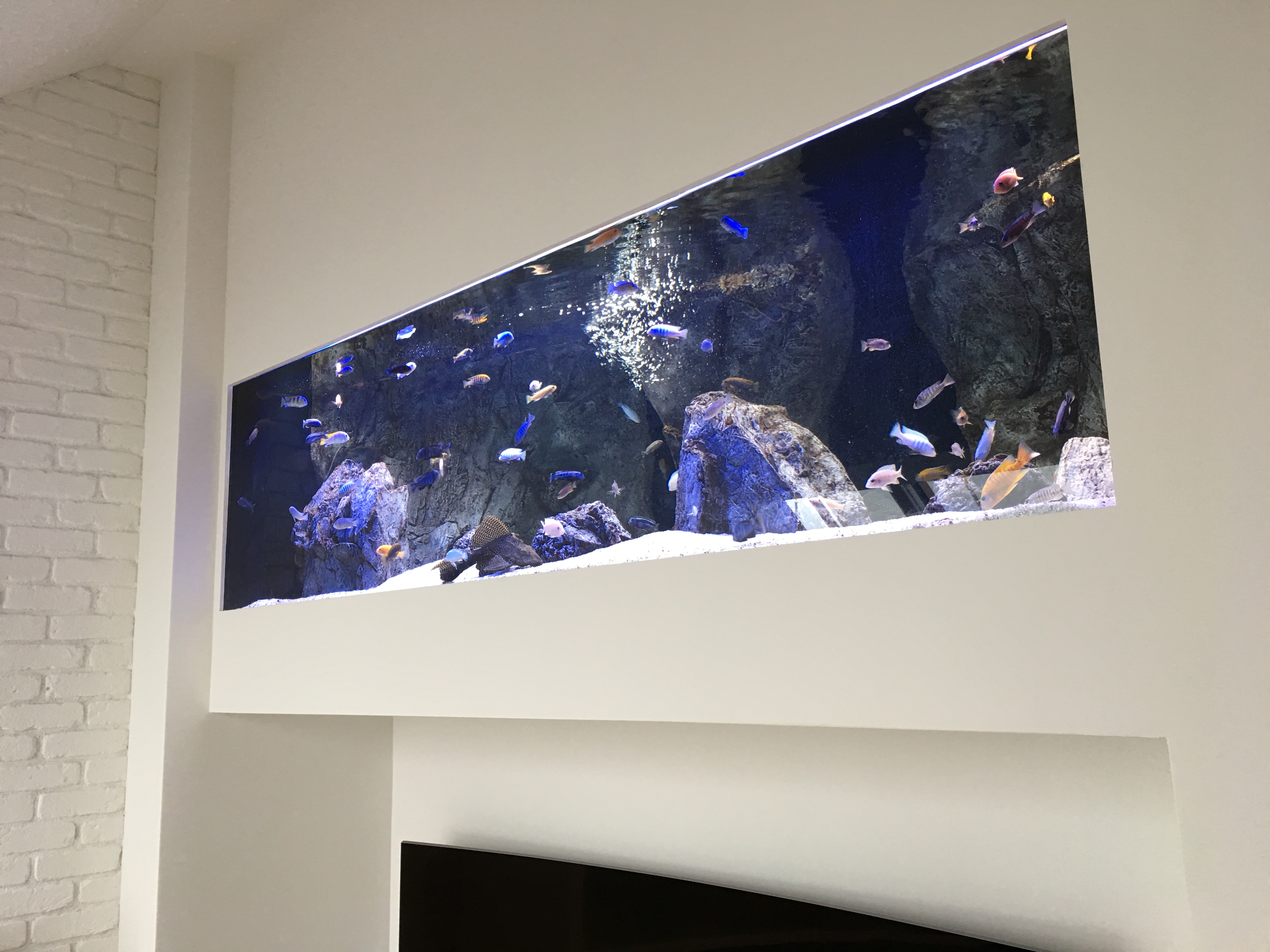 Realizace akvária u stropu obývacího pokoje.
