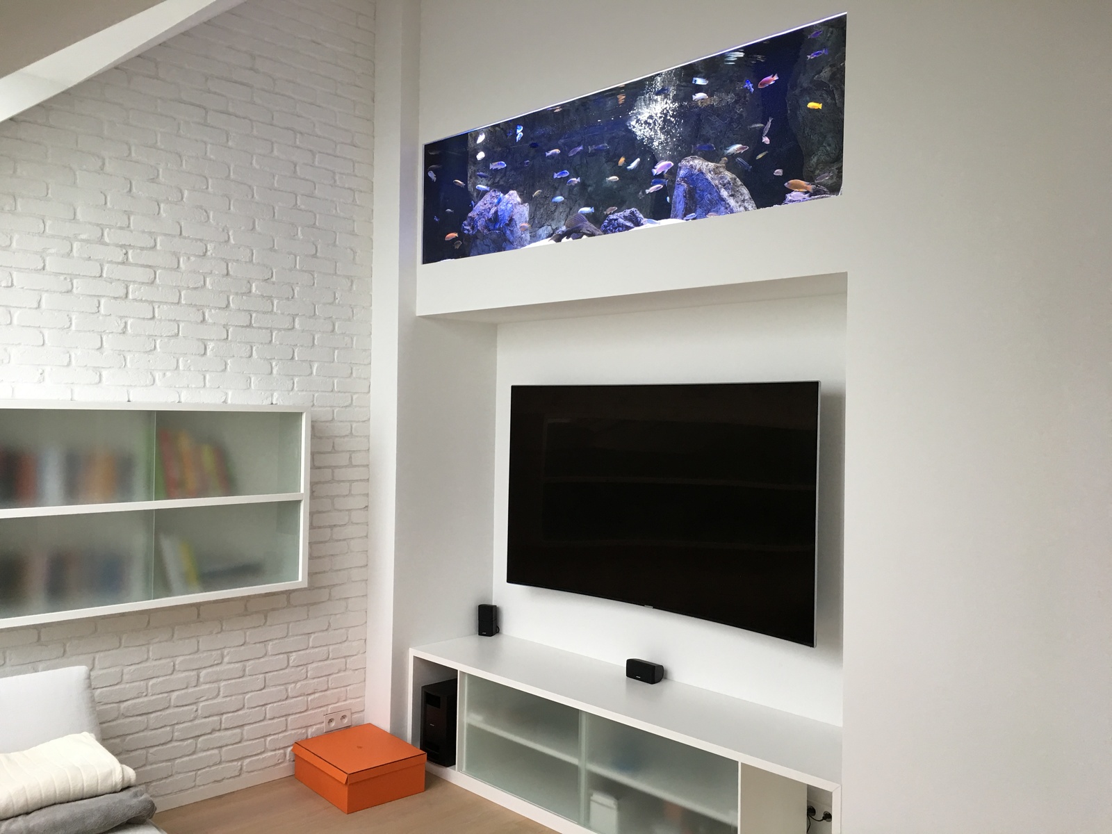Realizace akvária u stropu obývacího pokoje.